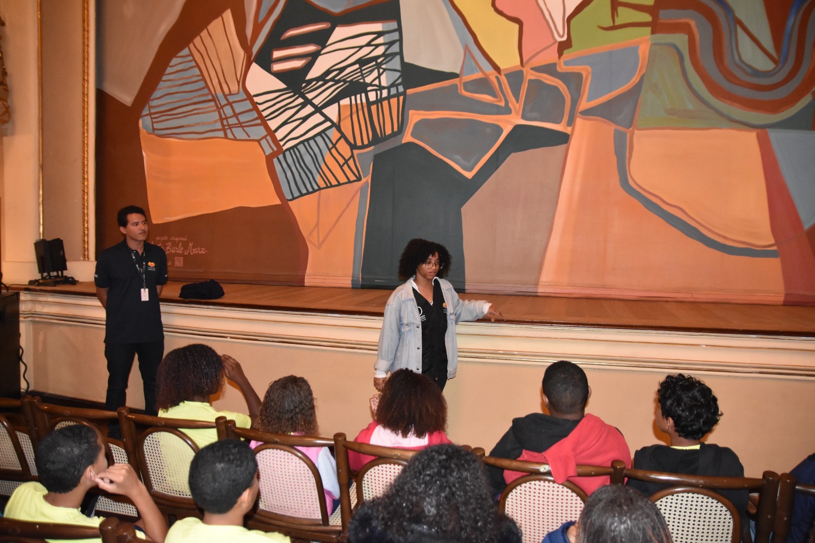 Os alunos conheceram todos os andares e espaços da instituição, incluindo o Salão Nobre, local onde aconteciam bailes privados para membros da corte, e o palco.