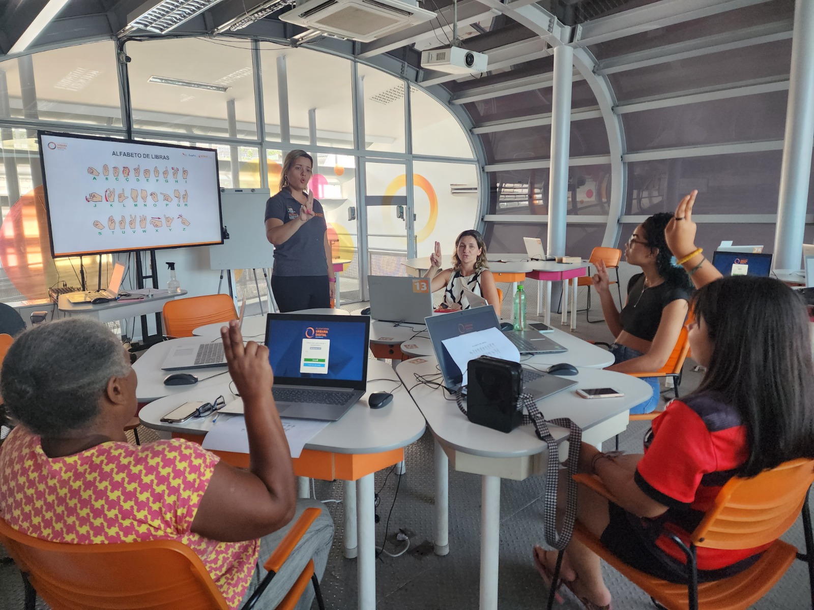 Visita guiada e atividade tecnológica com um grupo de alunos,uma professora e uma estagiária surda, além de intérpretes de LIBRAS da Escola Municipal Paulo Freire.